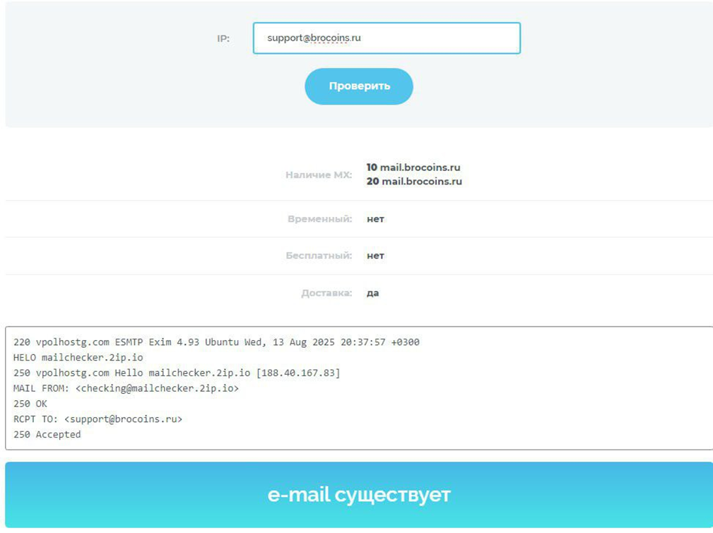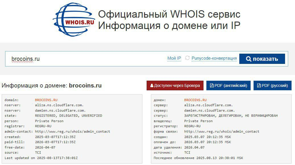 Зарегистрирован домен обменника Brocoins в марте 2025 года. Проработал он почти полгода. Его владельцы не нацелены на продолжительный срок деятельности, так как домен продлен лишь до 2026 года. Как правило, добросовестные платформы нацелены на многолетнюю работу.Служба поддержки Brocoins Ru