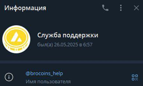 В качестве службы поддержки указан телеграм-менеджер brocoins help. Странно то, что последний раз он в сети был 26 мая в 2025 году. На момент написания обзора он не отвечает и скорее всего, его аккаунт скоро будет удален за неактивность. Также есть адрес электронной почты support brocoins ru. Проверка доказала, что он существует, но отвечают ли на запросы, выяснить не удалось.