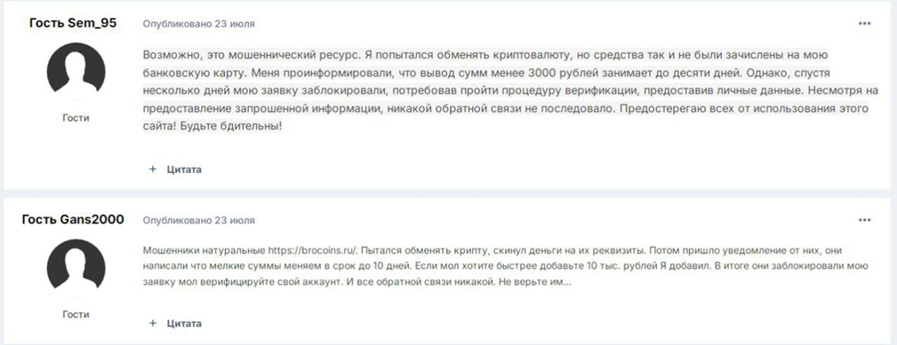 В отрицательных отзывах об Brocoins пользователи рассказывают, что при обмене средства так и не были зачислены на карту. Обещали, что нужно подождать 10 дней, но в итоге ничего не пришло. У другого клиента владельцы платформы вообще заблокировали аккаунт и закрыли доступ к сайту без объяснения причин.