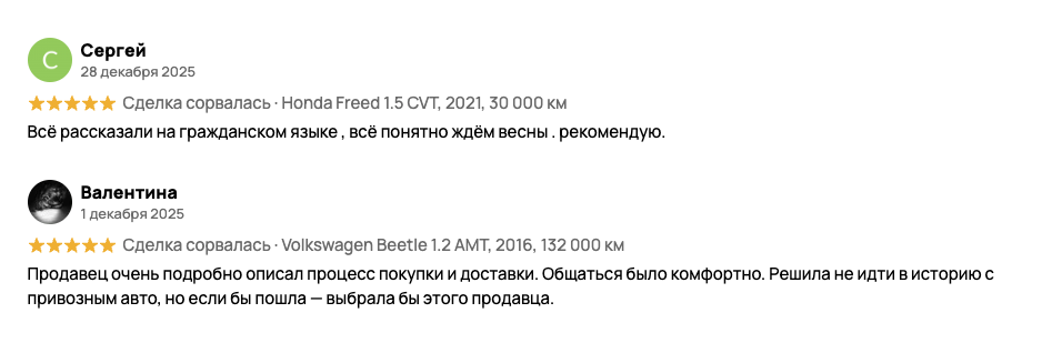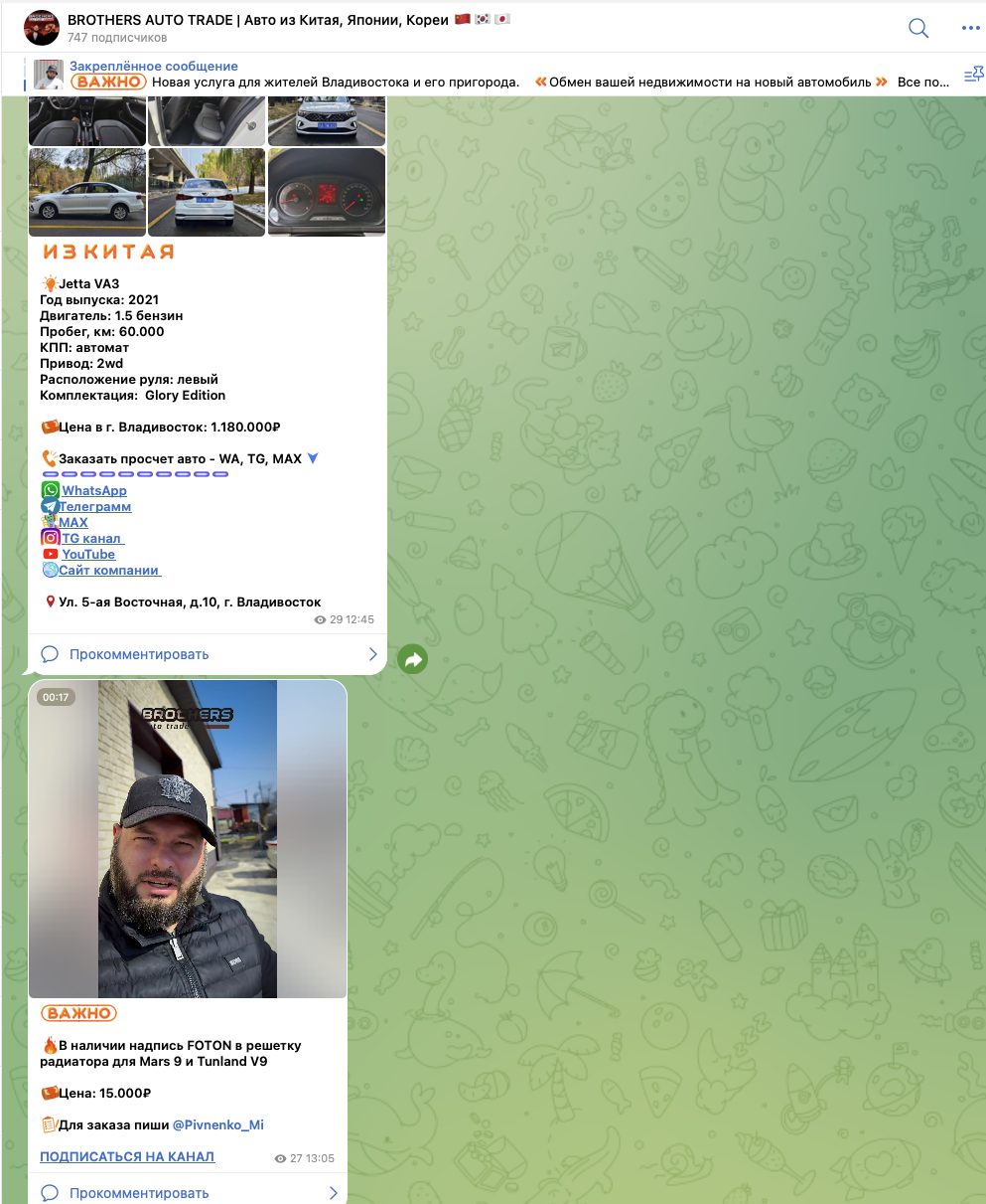 На связанных с проектом площадках проводят обзоры автомобилей, а также предлагают оформить заказ на пригон с доставкой по России. Весь список актуальных предложений с ценами можно увидеть в профиле на Авито.