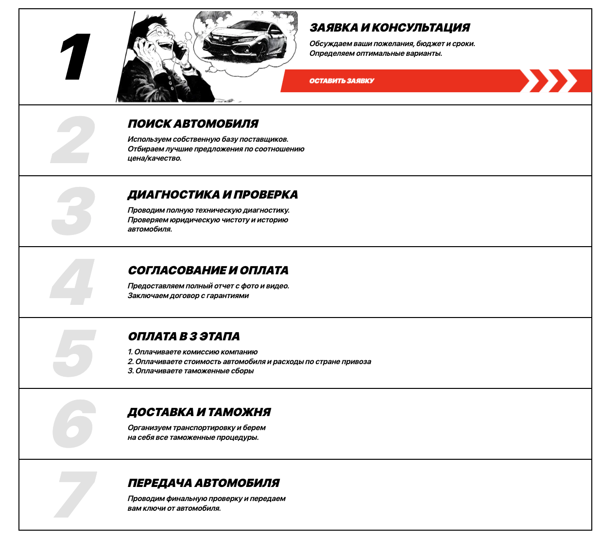 Информация по стоимости услуг не разглашается. Представлена лишь краткая справка об этапах работы по пригону: