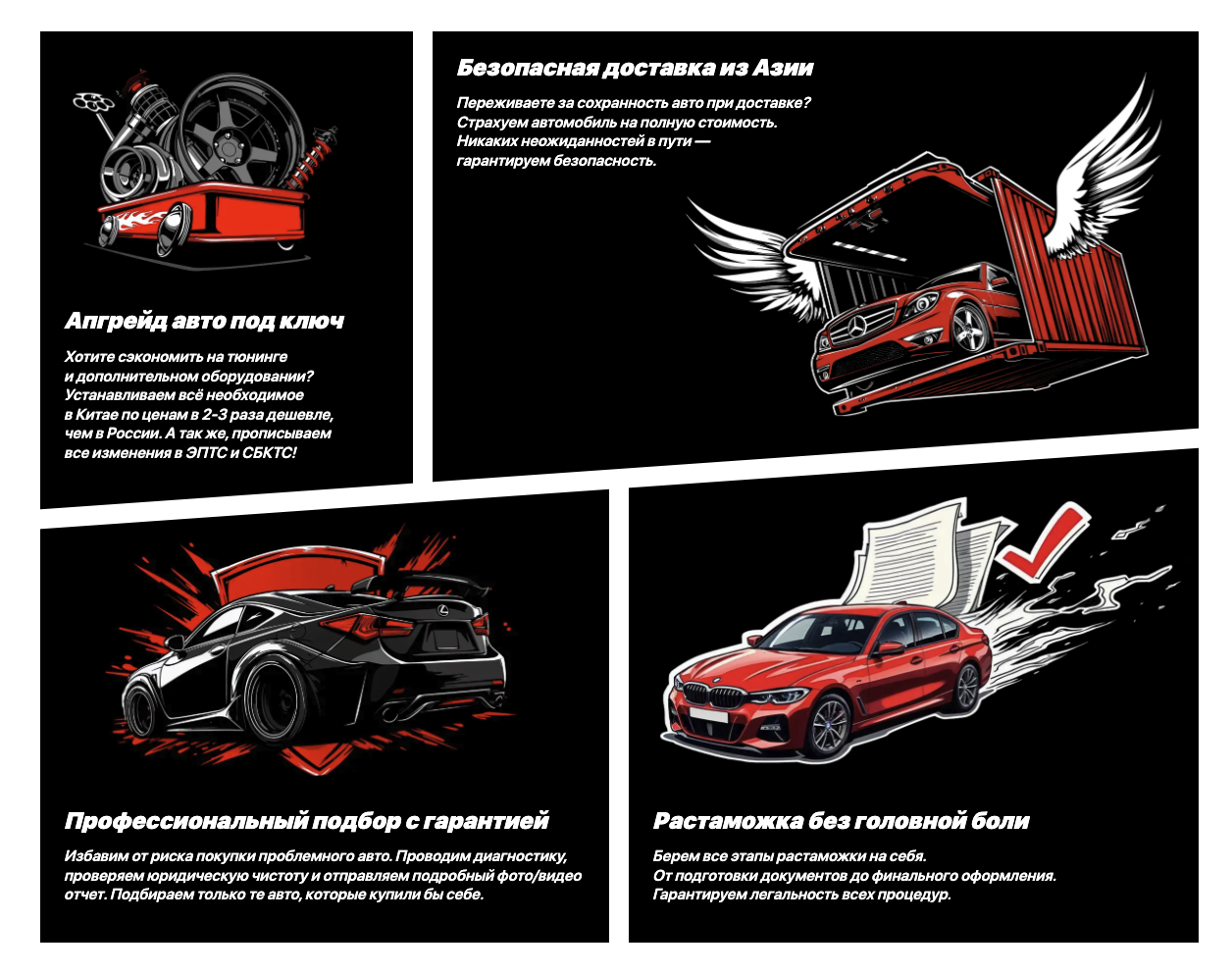 Среди услуг компании указаны не только пригон авто, но и тюнинг, растаможка и подбор транспортных средств.