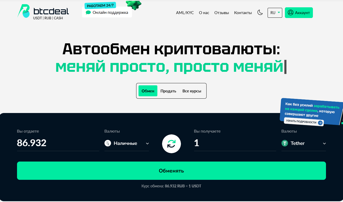 Сайт Btcdeal оформлен в минималистичном стиле. Основное внимание уделено скорости и удобству обмена. На главной странице представлены ключевые направления USDT | RUB | CASH. Есть кнопки для регистрации, входа и разделы AML/KYC, Отзывы, О нас и Контакты.