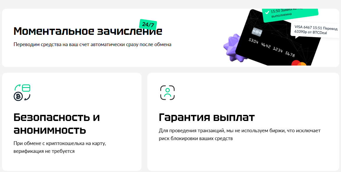 На сайте btcdeal ru указано, что цель проекта – создание надежной площадки для обмена токенов и фиата. Обменник обещает клиентам быстрое выполнение операций – от 5 до 10 минут. Команда обменника Btcdeal фиксирует курс на 15 минут и предоставляет круглосуточную поддержку. Телеграм-бот дублирует статус заявки на почту и в мессенджере.