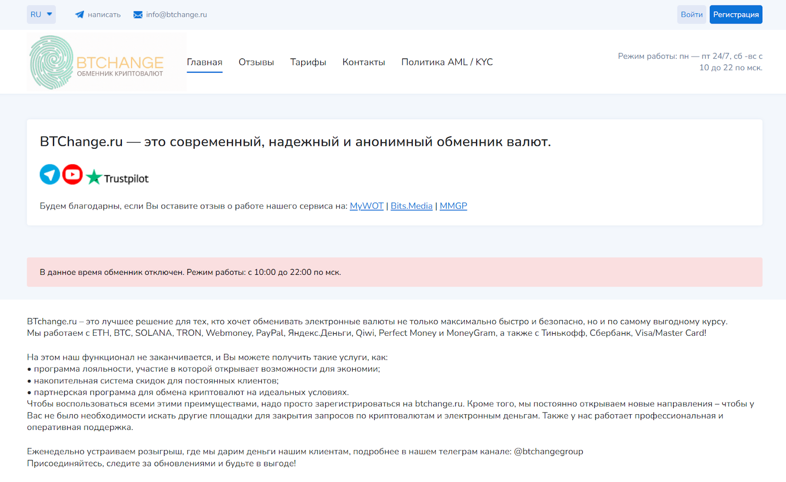 Организация не указывает на сайте прямые контактные данные, с техподдержкой можно связаться через форму обратной связи или онлайн-чат, а также по e-mail Info btchange ru. Есть также аккаунт в Telegram с ником Btchangeru.