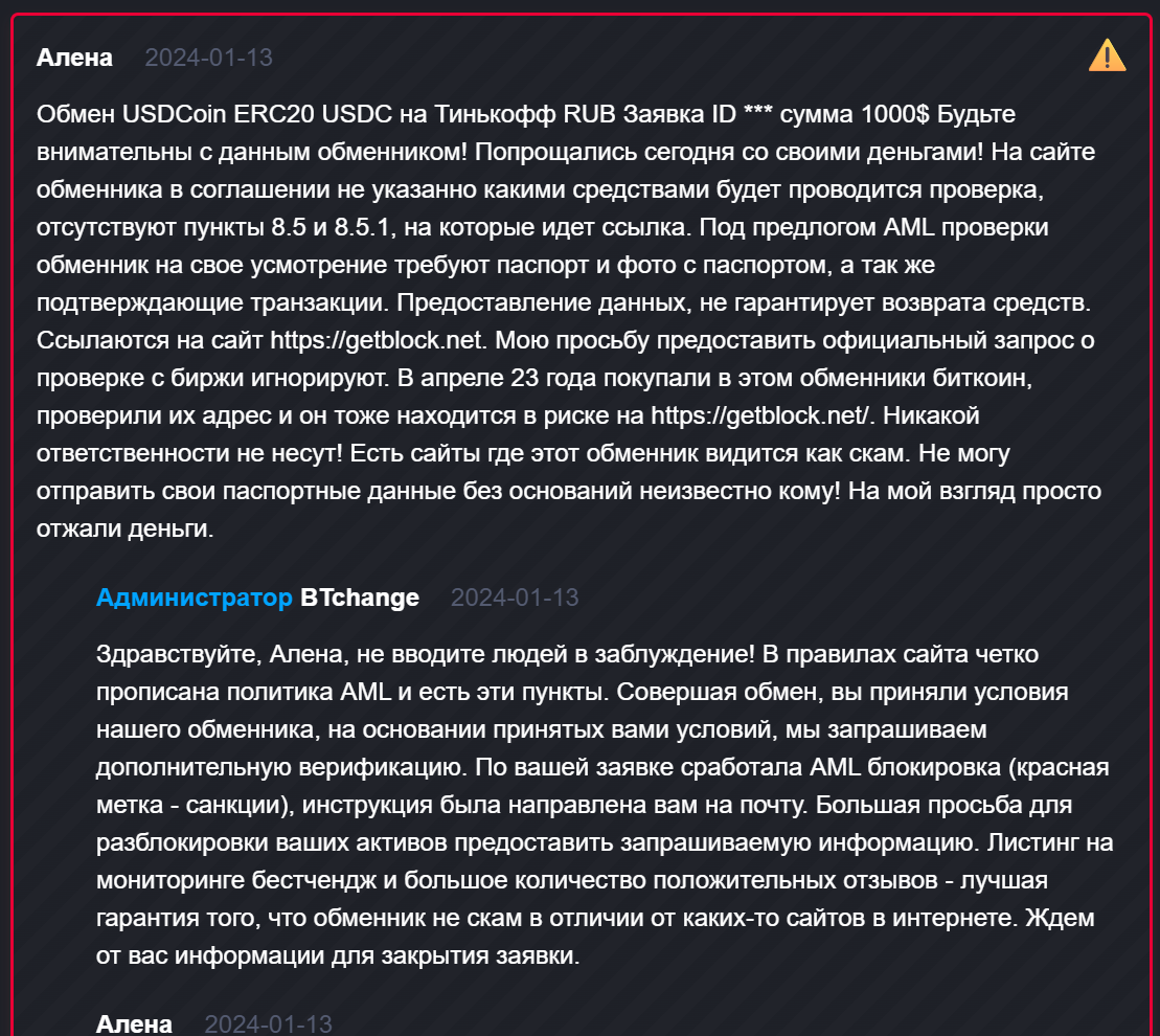 • отрицательные отзывы о BTchange ru содержат информацию о блокировке криптовалютных активов в ходе проверки AML и невозможности их возврата, это может быть лишь предлогом для присвоения средств клиентов.