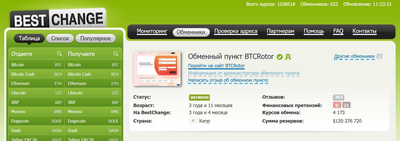 Обменник BTCRotor есть в авторитетном мониторинге BestChange, что вызывает доверие к нему. Там он находится уже более 3 лет.