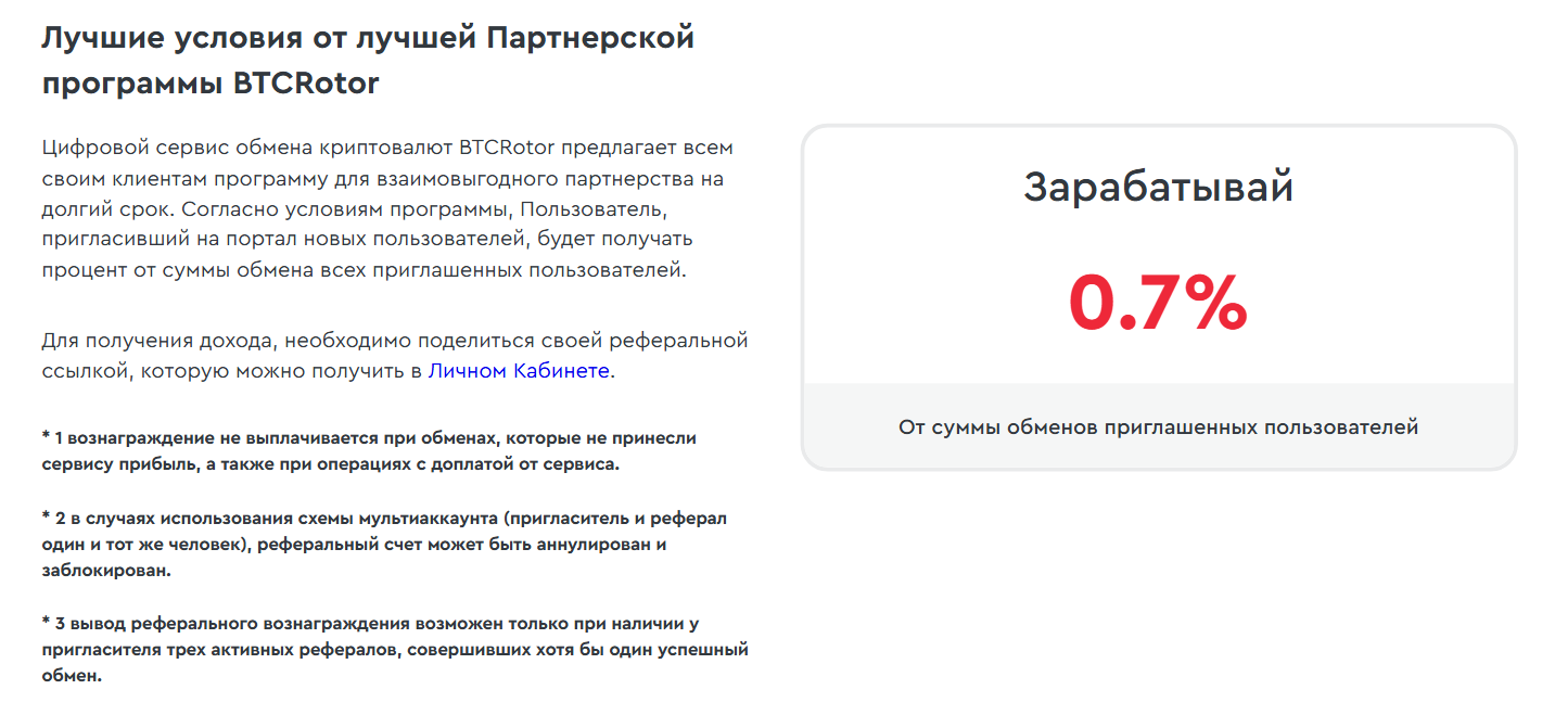 Обменник BTCRotor предлагает участие в реферальной программе. Нужно приглашать новых клиентов, за что сервис готов платить 0,7% от суммы обменных операций рефералов. Выводить вознаграждение можно при условии, что уже привлечено не менее трех человек, и хотя бы один из них совершил обмен.