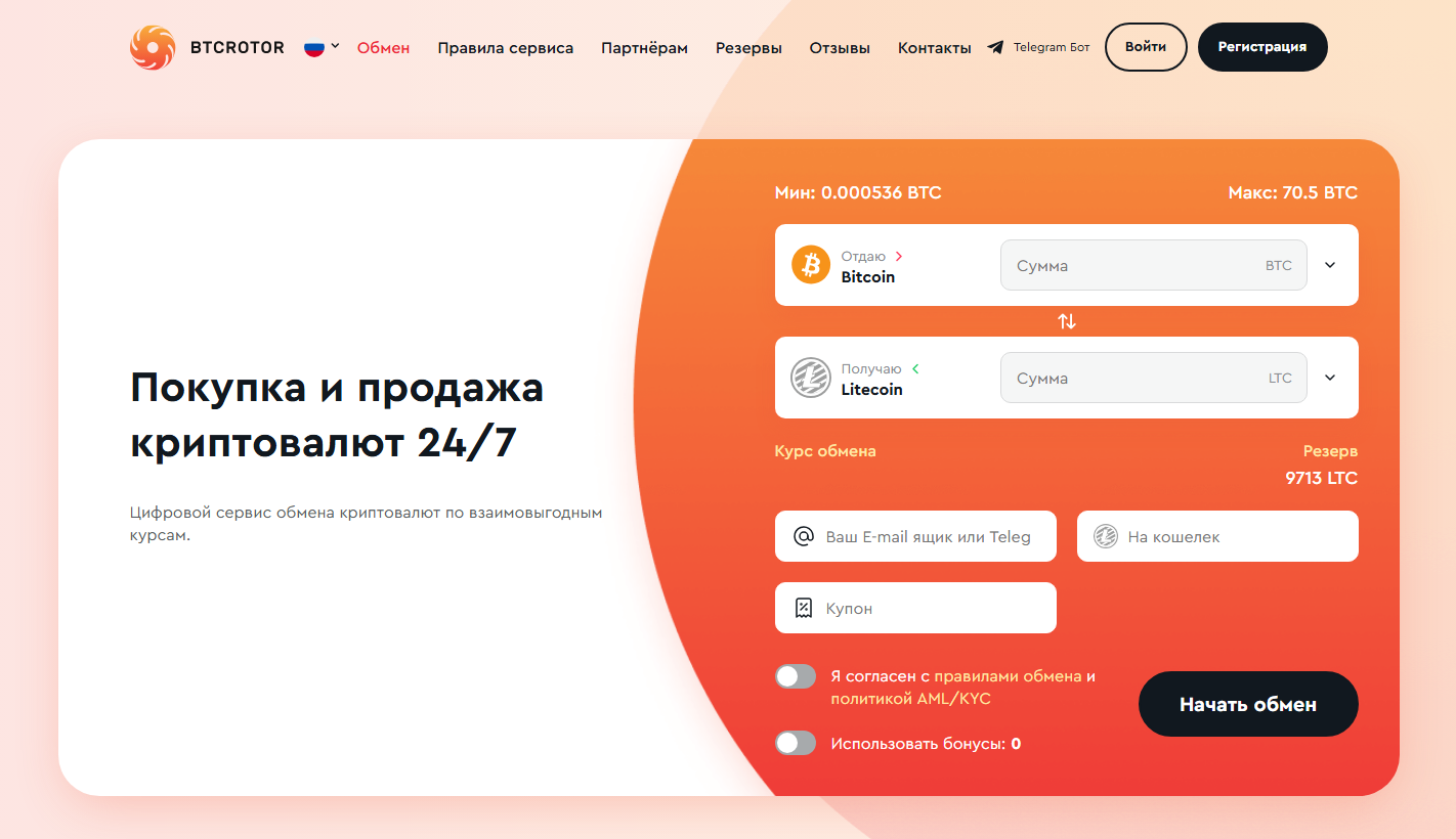 BTCRotor – онлайн-обменник криптовалют и фиат. Оказывает услуги 4 года. Обещает выгодный курс и быстрое исполнение обмена активов. Подробнее расскажем о нем далее.