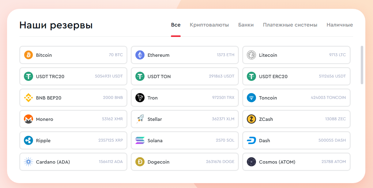Посмотреть резервы интересующих активов также можно в соответствующем разделе сайта. Насколько информация достоверная, сказать сложно.