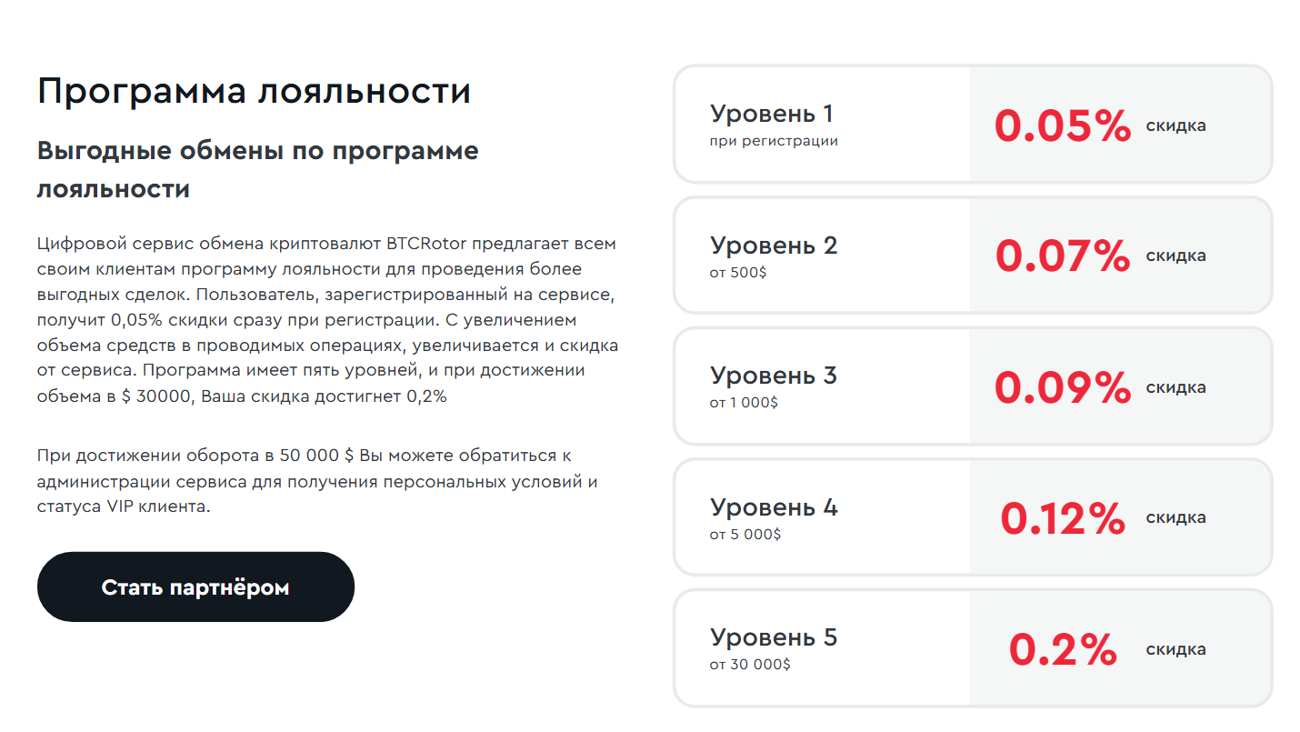 Также обменник предлагает клиентам программу лояльности. При регистрации новичку сразу дают скидку на обмен 0,05%. Далее дисконт будет расти по мере увеличения объема совершенных транзакций:
