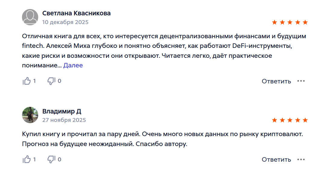 Алексей Михайлов отзывы о своей книге получил преимущественно позитивные. Люди указывают, что темы раскрыты хорошо и понятны. Выделенные направления, которые касаются децентрализованных инструментов и инвестиций в полной мере отвечают на вопросы читателей.