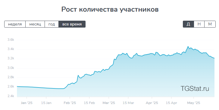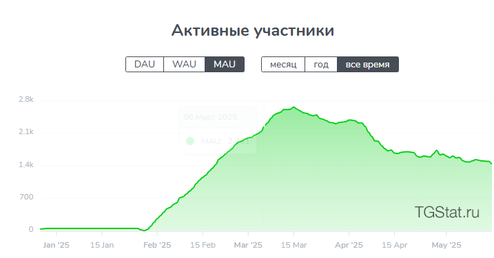 Касаемо развития чата. Накачивался часть ботами или нет — сложно определить. График прироста подписоты более-менее плавный. Но заметны скачки в феврале и марте 2025 года. И в эти же периоды времени в чате происходили всплески активности аудитории.