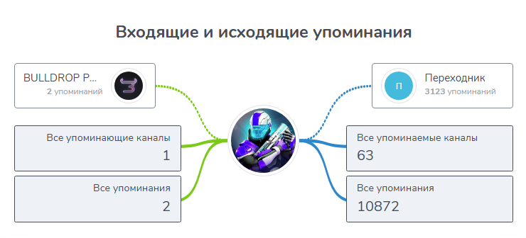 Внешних ссылок на Bulldrop chatik мало. А ссылок от авторитетных проектов и то всего одна — от канала @pubg_bulldrop с 40-тысячной аудиторией. Зато исходящих ссылок с Bulldrop chatik на другие каналы и чаты более 60, а всего — более 10 тысяч упоминаний других проектов.