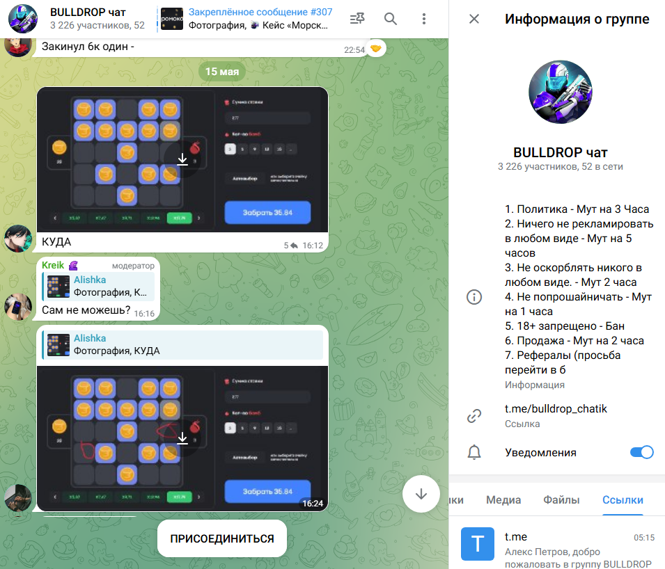 BULLDROP чат создан в 2023 году. На май 2025 года здесь 3,2 тысячи участников, а постоянный онлайн примерно 100-200 человек. Час весьма активный — ежедневно здесь публикуются десятки, а иногда даже сотни сообщений. Пользователи могут открывать кейсы, получать внутриигровые предметы и участвовать в розыгрышах.