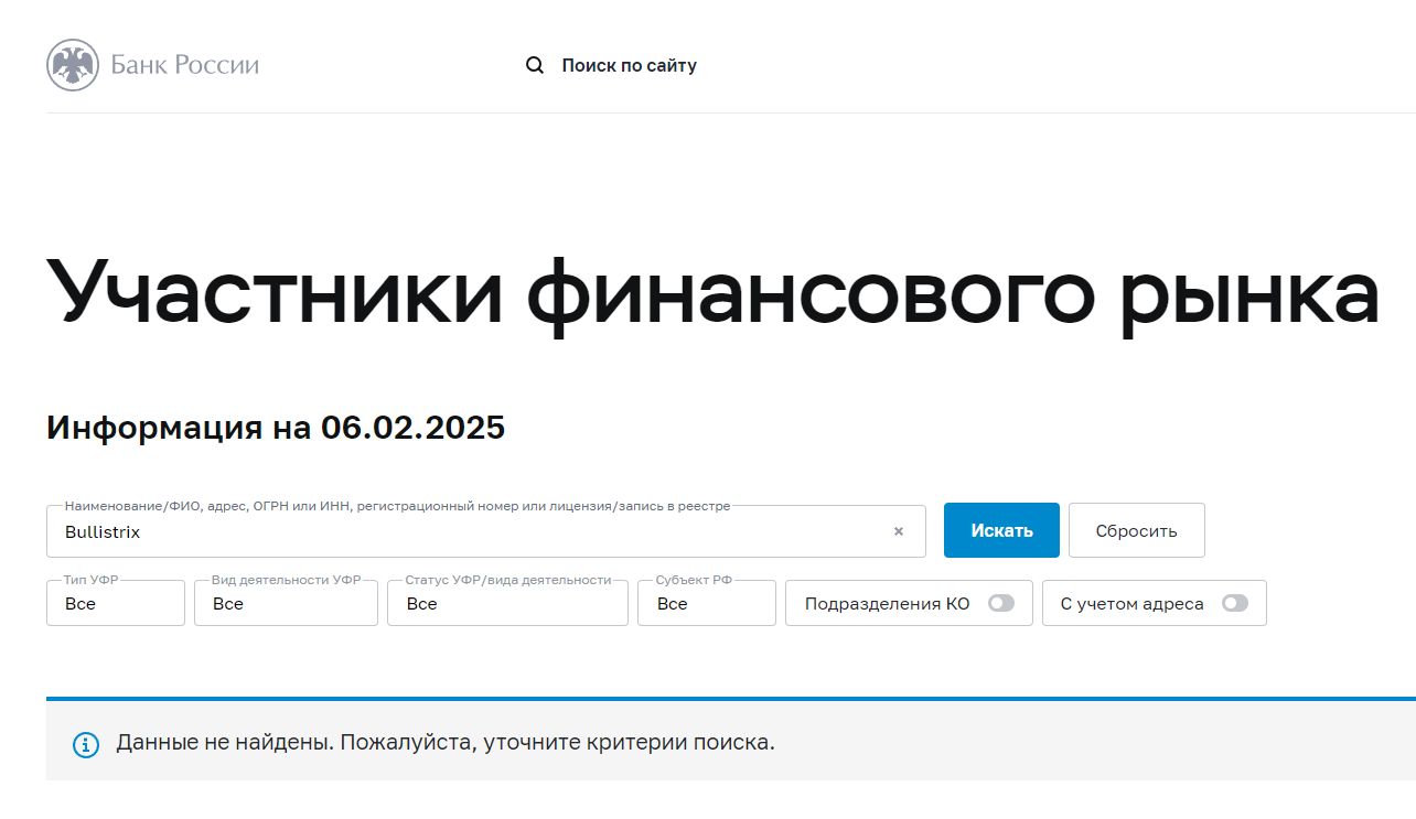 Результат утвердительный – площадка не числится в базе, а это значит, что компания не подпадает под регулирование российских финансовых органов и в случае кражи средств клиента, возврата не последует.