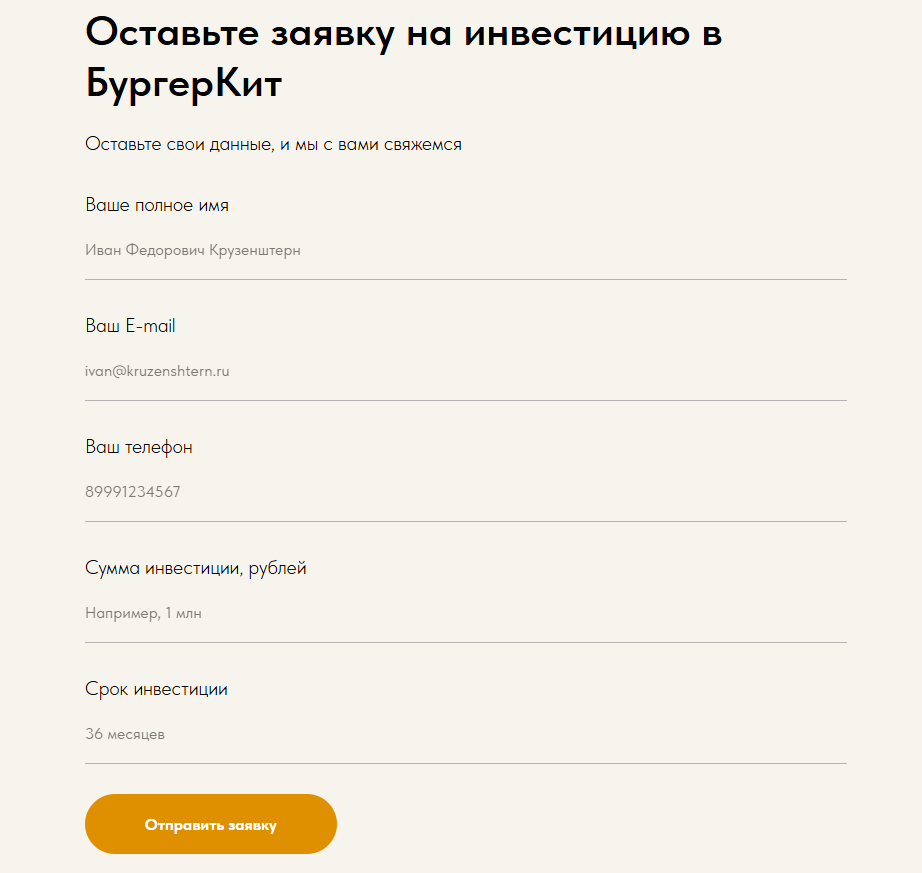 В конце нам предлагают оставить заявку, указав имя, почтовый ящик, номер телефона и желаемые сумму и срок инвестиции.В целом организация и вправду выглядит надежной и, судя по наличию продукции в разных магазинах, пользуется спросом. Вот только вопросы возникают конкретно к рассматриваемой странице, где нам предлагают вложиться в Бургер Хит.