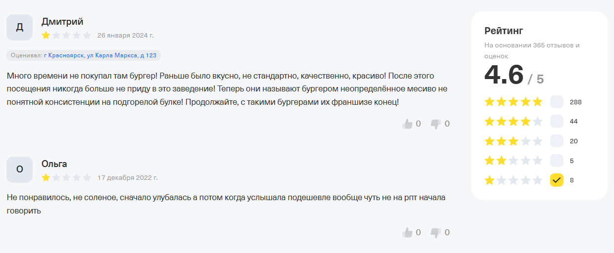Отзывов именно об инвестициях в Бургер Кит в интернете не нашлось, но можно изучить мнение обычных потребителей о продукции корпорации. На одном из популярных ресурсов общая оценка – 4,6 баллов. Большинство комментариев позитивные, но есть и несколько сообщений от недовольных клиентов с жалобами на невкусную еду.
