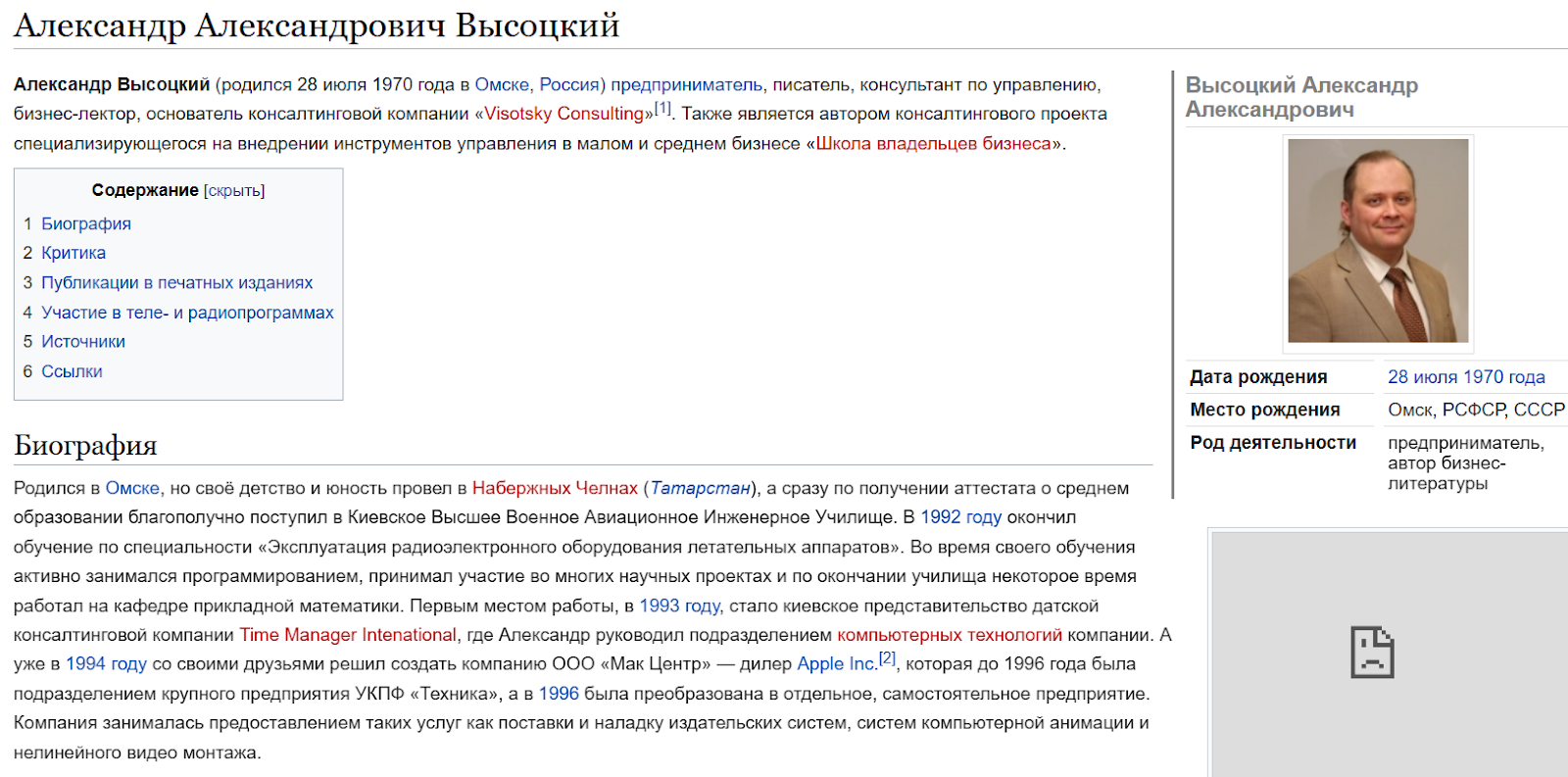 В интернете много информации про этого человека, однако поисковик «Яндекс» в основном дает ссылки на страницы, которые создал сам коуч. Это признак того, что Александр Высоцкий — инфоцыган, который ничего из себя не представляет, но создает много информационного шума.Исключение — сайт «Циклопедия», который подробно описывает биографию Александра. Например, мы узнаем, что в 1992 году он окончил авиационное инженерное училище. Таким образом, его образование не соответствует его текущей деятельности.