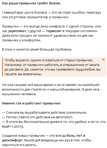 В одном из постов Высоцкий рассказывает, что главный враг бизнеса — это привычки его владельца. В этой публикации нет глубоких мыслей и личного опыта автора. Текст выглядит дилетантским.
