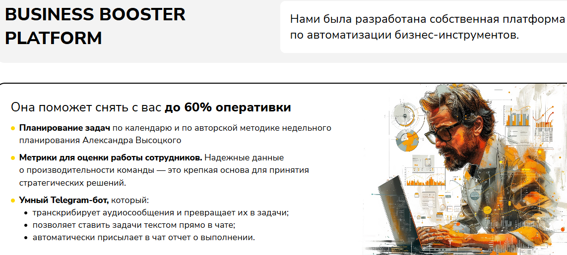 Александр активно рекламирует на своем сайте My Bbooster Online некую «Операционную систему для бизнеса». Он подробно рассказывает, что она из себя представляет, что можно считать плюсом. Речь идет об онлайн-платформе, которая выполняет конкретные функции: планирование задач по календарю, метрики для оценки сотрудников и так далее. Каждый предприниматель может представить, подходят ему такие решения или нет.