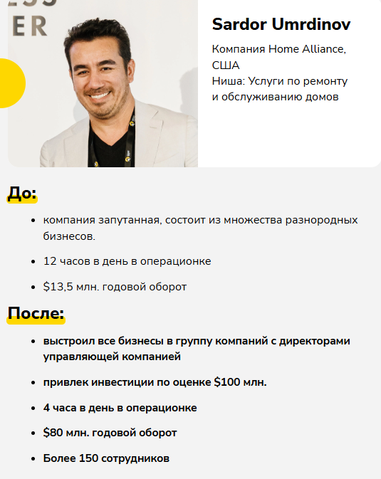 Высоцкий демонстрирует один из кейсов: якобы ему удалось оказать помощь владельцу компании Home Alliance из США. Но он не дает никаких ссылок, по которым можно было бы связаться с предпринимателем и проверить факт сотрудничества.