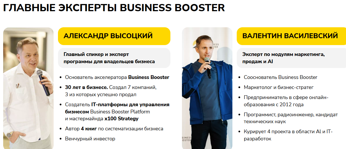 Полезность любого курса почти целиком определяет личность его автора. Платформу «Бизнес Бустер» создал Александр Высоцкий, который называет себя бизнесменом с 30-летним опытом и «главным спикером программы для владельцев бизнеса». Но мы не видим никаких реальных подтверждений его успеха.