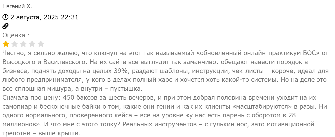 Автор второго отзыва о бизнес-тренере Александре Высоцком жалеет, что пошел к нему на «Практикум». Аферист не дает реальных кейсов и инструментов, а лишь травит байки о том, какой он гений.