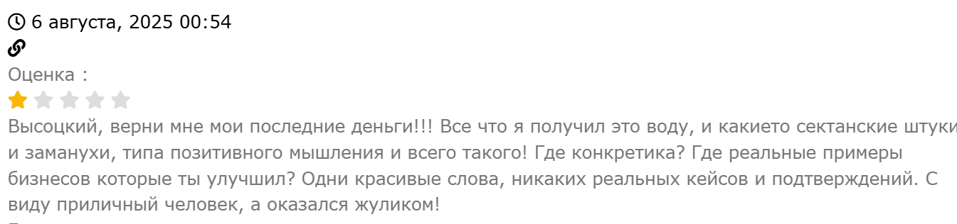 - Пользователи в своих отзывах о Высоцком называет его сектантом-сайентологом. Они жалеют, что купили у него «воду» под видом обучения.