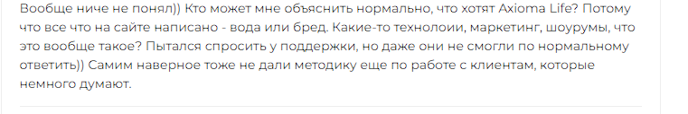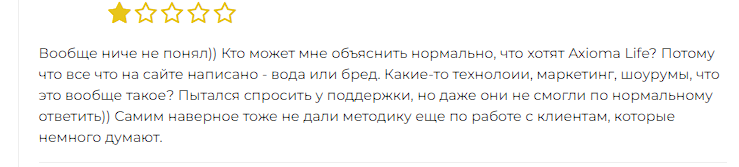 Комментарии о деятельности этой компании преимущественно негативные. Например, один пользователь жалуется на непонятные условия сотрудничества и невнятные ответы техподдержки info axiomalife biz.