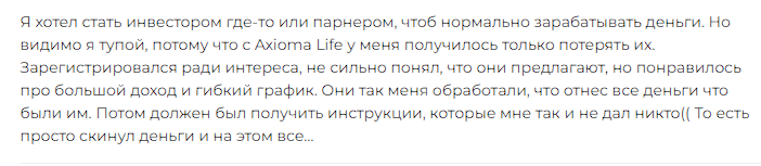 - Многочисленные жалобы на непрозрачную работу Axioma Life, отсутствие нормальной поддержки, невозможность вернуть вложенные деньги. А вот конструктивных позитивных отзывов обнаружить не удалось.