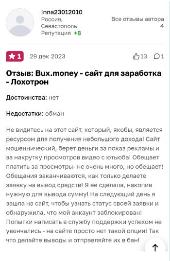 Отзывы на баксмоней оказались по большей части негативными. Оплата за задачи совсем небольшая, но даже с ней владельцы проекта не хотят расставаться. Аккаунт могут заблокировать без особых причин или обвинить в автоматизации. Доказать свою невиновность можно, но придется опять тратить время.