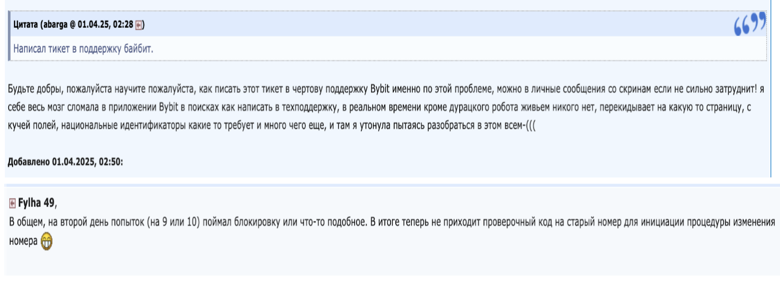 На форумах рассказывают, как после долгих попыток оформить Bybit Card получали блок без объяснения причин. Другие жалуется, что коды верификации перестали приходить на старый номер, а поддержка требует скриншоты или молча перенаправляет на бота.