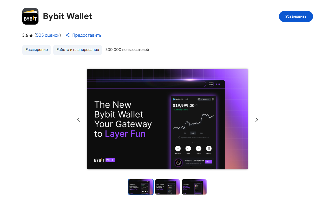 Расширение Bybit Wallet можно бесплатно установить в Google Chrome и других браузерах на движке Chromium (Microsoft Edge, Brave, Opera, Vivaldi и пр.). Данный функционал подходит только для подключения к dApps, если требуется совершать покупку или продажу криптовалют с банковских карт, то придется воспользоваться биржевым кошельком Байбит Валлет.