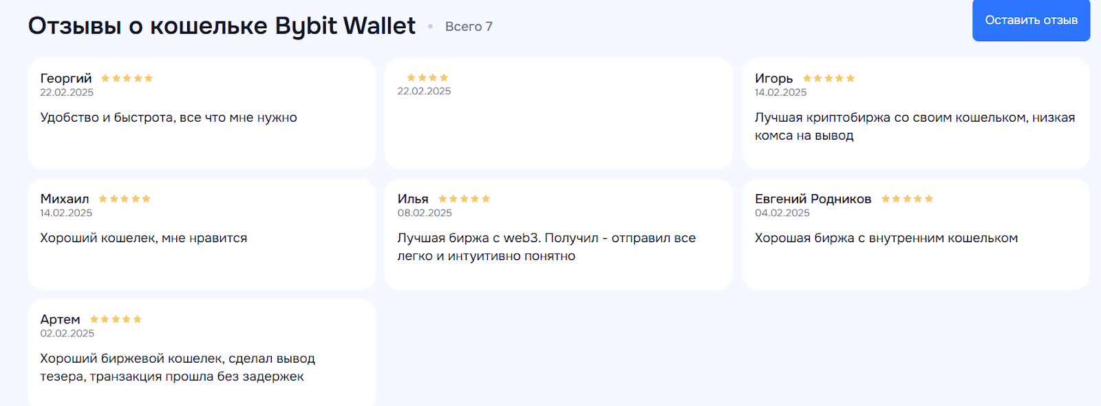 Отзывы о криптокошельке Bybit Wallet преимущественно положительные. Пользователи считают его удобным и надежным, внутренние переводы происходят мгновенно, вывод средств зависит от загрузки сети, как правило, это очень быстрый процесс. Функционал простой, интерфейс понятный, разобраться сможет даже новичок. На сайте биржи есть подробные гайды по настройке и работе с кошельком.