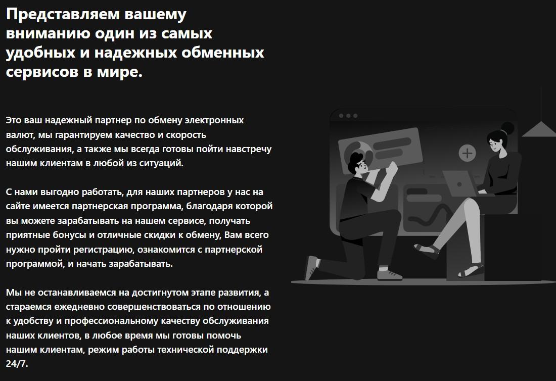 В разделе «О нас» нет конкретных данных, что это за компания, кто ее создатели. Здесь представлена только общая информация о преимуществах обменного пункта. Владельцы рассказывают, что пользоваться их сервисом безопасно и выгодно.