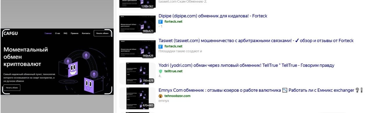 Еще один момент – таких сайтов, как Cafgu com, в интернете множество. Они все идентичные. Только названия обменных пунктов отличаются. Это тоже распространенная практика мошенников. Они создают десятки сайтов для обмана пользователей.