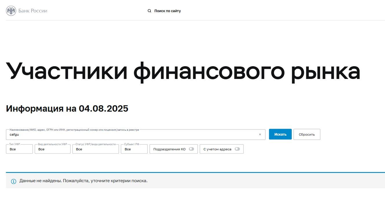 На сайте нет документа о регистрации компании, нет лицензии на оказание обменных услуг. Мы не обнаружили сервис ни в одном финансовом регуляторе, включая Центробанка России. Обменник Cafgu com работает незаконно.