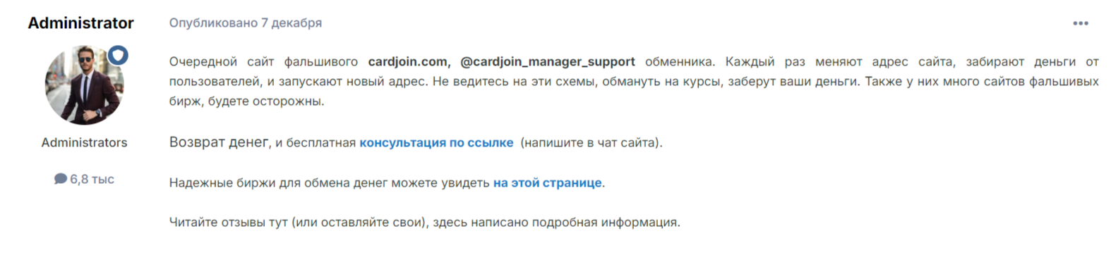 Cardjoin com – проект-обменник, манипулирующий с курсами, комиссиями. Пользователи, желающие произвести обмен цифровых активов, сталкиваются с якобы выгодными условиями. Но во время совершения сделки становится ясно, что согласованный курс и итоговая сумма не такие, как было заявлено ранее. Из-за этого клиенты теряют деньги.