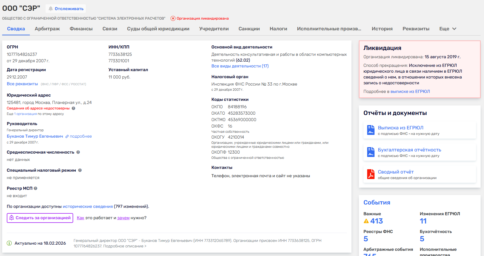 В контактах команда проекта указала адрес офиса в Москве, столичный номер телефона и реквизиты ООО «Система Электронных Расчетов». Однако проверка по ИНН показала, что компанию ликвидировали еще 15 августа 2019 года. То есть юридические гарантии для пользователей отсутствуют полностью, если сервис вообще еще предоставляет свои услуги.