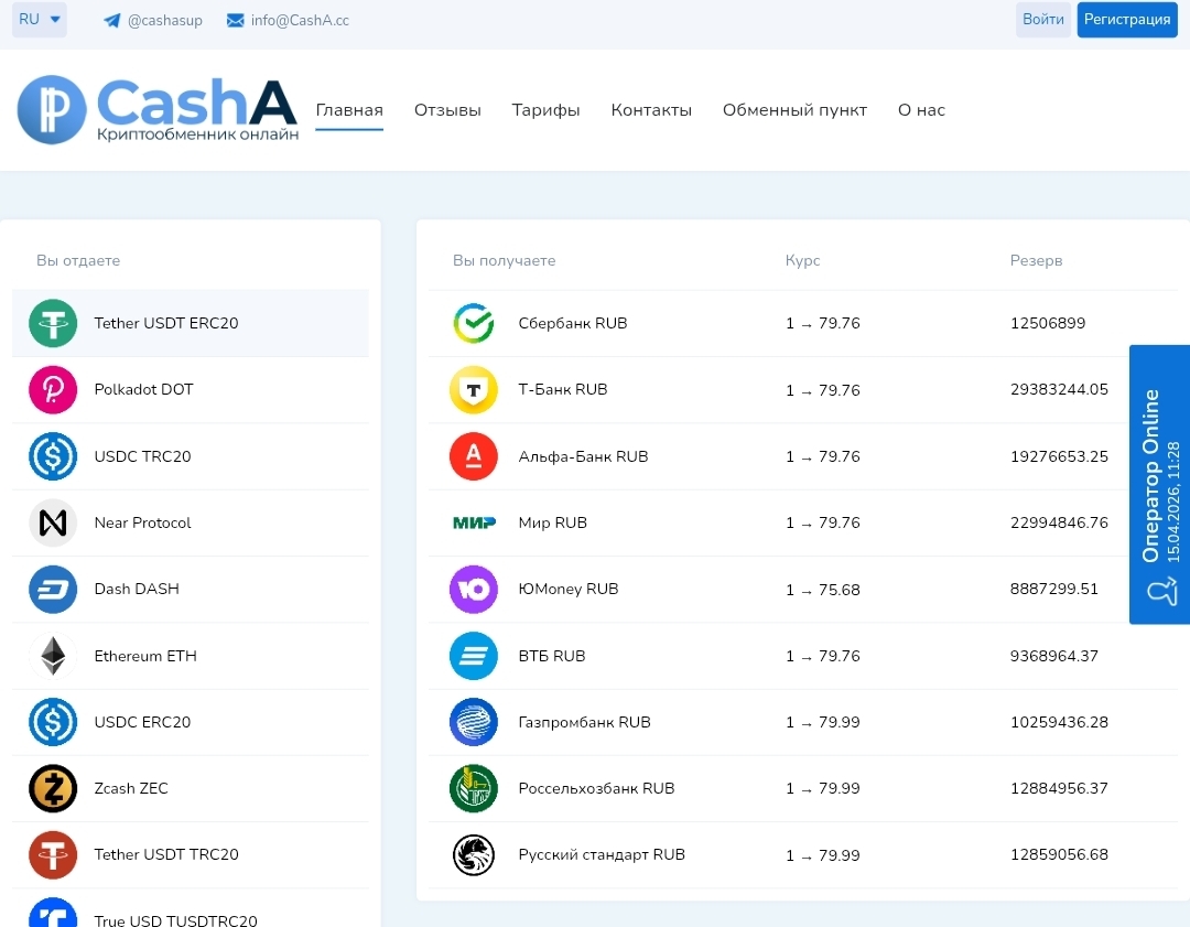 На сайте casha cc отсутствуют публичные данные о юридическом лице: нет страны регистрации компании, нет регистрационного номера, нет физического адреса. Единственные контакты — Telegram cashasup и email info CashA cc. Для сравнения: обменник Kassa cc, с которым Casha визуально схожа, зарегистрирован в Эстонии, имеет регистрационный номер, юридический адрес, телефон и подпадает под законодательство ЕС. Это принципиальная разница с точки зрения правовой защиты клиента при возникновении спора.