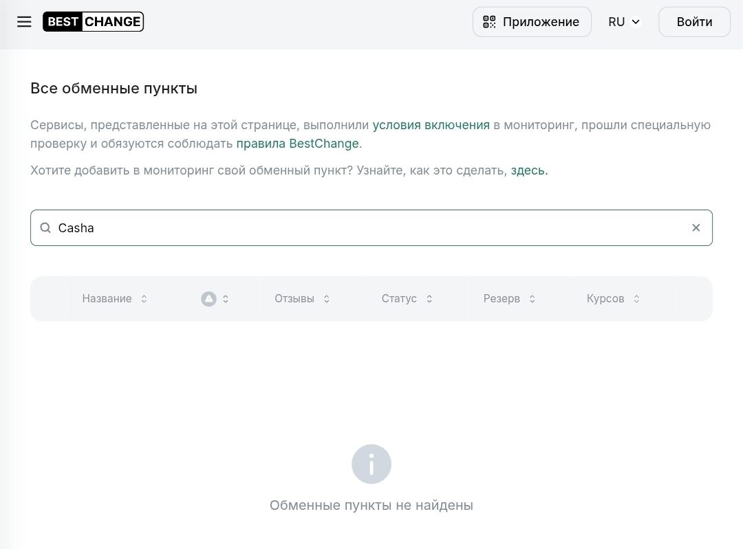 Первое, что делает опытный участник рынка перед работой с новым обменником — проверяет его наличие на Bestchange. Это ключевой агрегатор обменных сервисов, где каждый листинговый участник проходит ручную модерацию, проверку резервов и деловой репутации. Биржа обменник Casha cc в листинге Bestchange отсутствует.