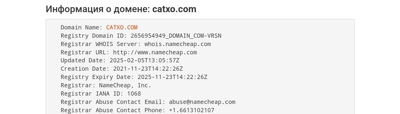 О дате создания проекта информации нет, но в документах указан 2021 год. Мы проверили информацию через сервис whois.ru и оказалось, что домен catxo.com действительно зарегистрировали в 2021 году.