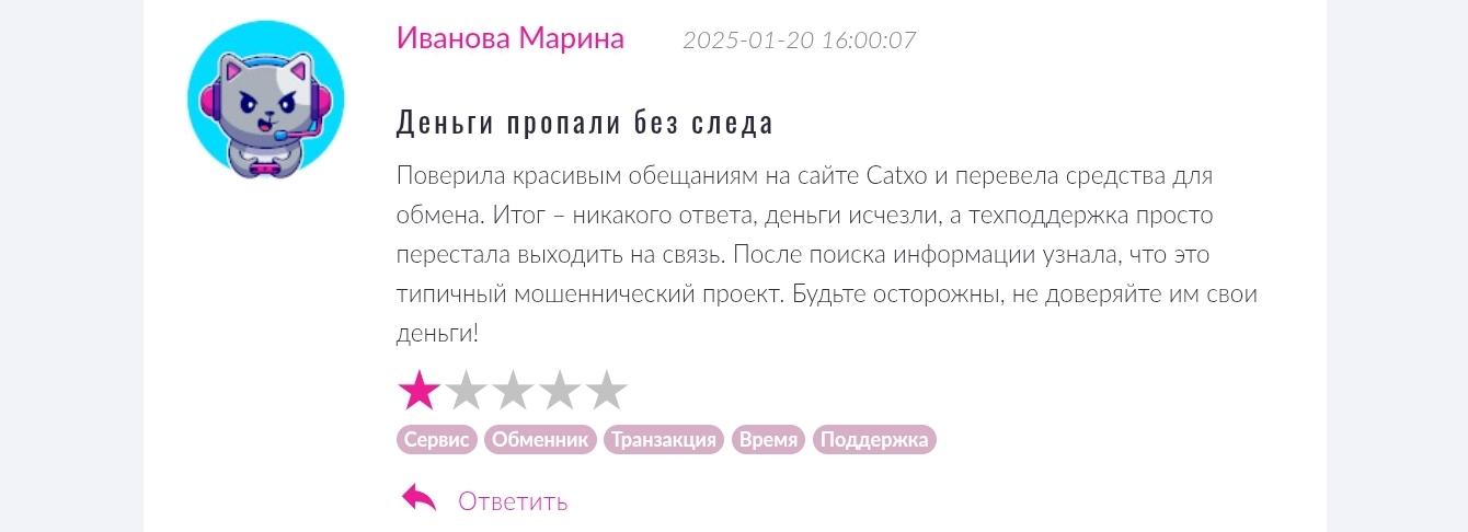В сети есть 4 отрицательных отзыва о catxo.com на сайте Metka Plus. Пользователи пишут, что поверили словам о высоком качестве сервиса, но после перевода их средства пропали. С поддержкой связаться невозможно, как и узнать какую-либо информацию.