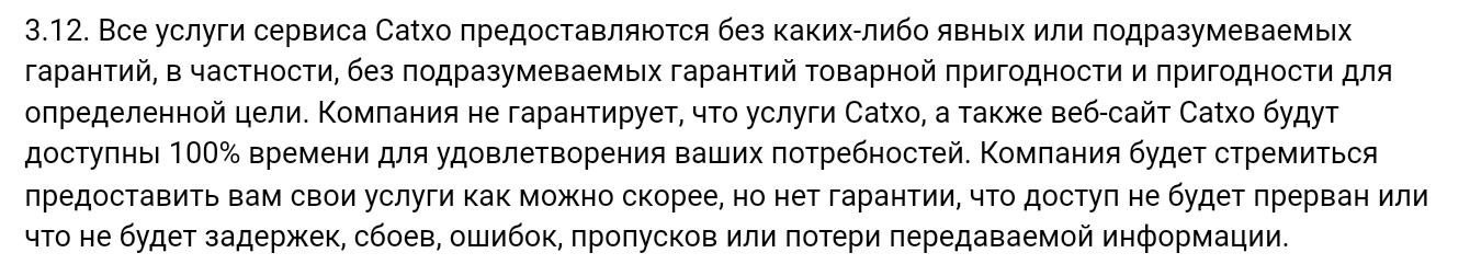 В документах и на сайте нет информации о компании и ее основателях. В качестве контактов указан только аккаунт в Телеграме @catxo_manager_support с именем Catxo support, которого не существует. На некоторых страницах написана просто ссылка на мессенджер, а не на профиль. Все это вызывает сомнения в прозрачности сотрудничества.