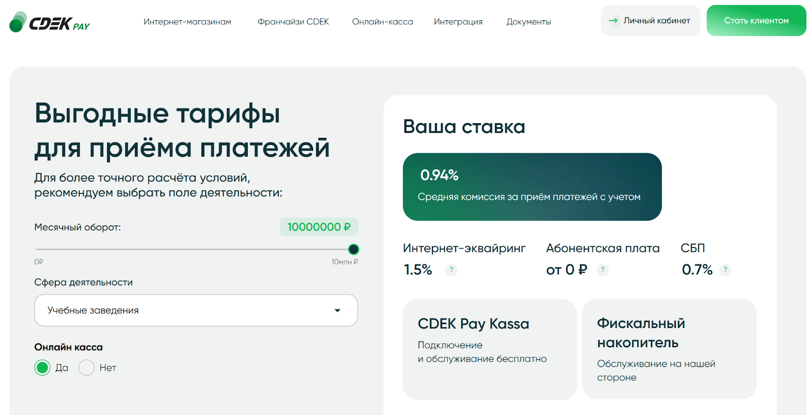 В личном кабинете CDEK Pay lk можно настроить удобные способы вывода средств. Поступающие от клиентов платежи располагаются на расчетном счете мерчанта, при заявке на перевод будет удержана комиссия. Схема вывода — на следующий рабочий день, мгновенное зачисление тоже возможно, но процент удержания будет выше. Компания предлагает выставлять счета на оплату в социальных сетях, мессенджерах, в приложениях, достаточно сгенерировать ссылку и отправить ее покупателю. Подключение онлайн кассы предоставляется бесплатно. Тариф зависит от оборота клиента, чем он выше, тем ниже комиссионные СДЭК Финанс. На сайте CDEKPay ru указано, что уже более 4500 компаний пользуется услугами СДЭК ПЭЙ.Компания предлагает заработок на партнерской программе. Можно привлекать интернет магазины и получать прибыль или уменьшать собственные расходы в CDEK. Подробности программы и условия подключения нужно уточнять у менеджеров, сделать это можно по электронной почте info cdekfin ru или заполнить форму франчайзи на сайте. На платформе есть калькулятор для расчета средней комиссии, для более точного определения процента нужно указать:
