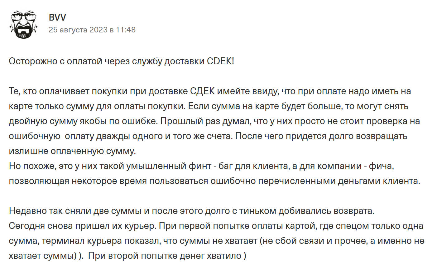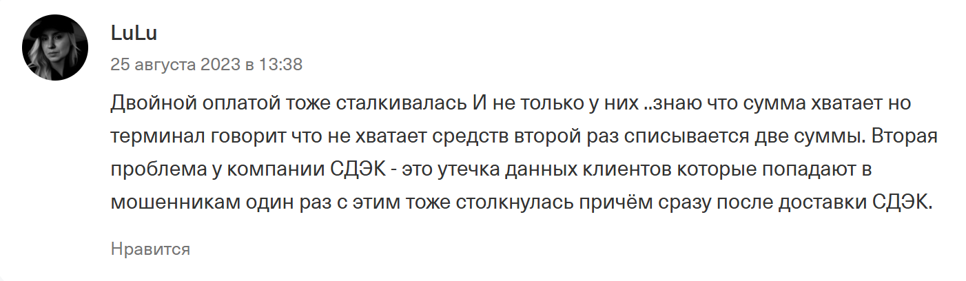Как о платежной системе, о CDEK Pay отзывы найти довольно сложно, а вот о самой компании мнения пользователей не всегда положительные. Основная претензия — двойное списание средств при покупке товаров через компанию. Происходит это так: если на карте клиента лежит сумма больше, чем требуется для оплаты заказа, то платеж в первый раз якобы не проходит, хотя деньги списываются, тут же проводится вторая транзакция, уже успешная. Деньги компания возвращает, но спустя пару месяцев и долгие диалоги с поддержкой СДЭК и банка. Фактически организация бесплатно пользуется средствами клиентами, потому что никаких компенсаций им не дает.