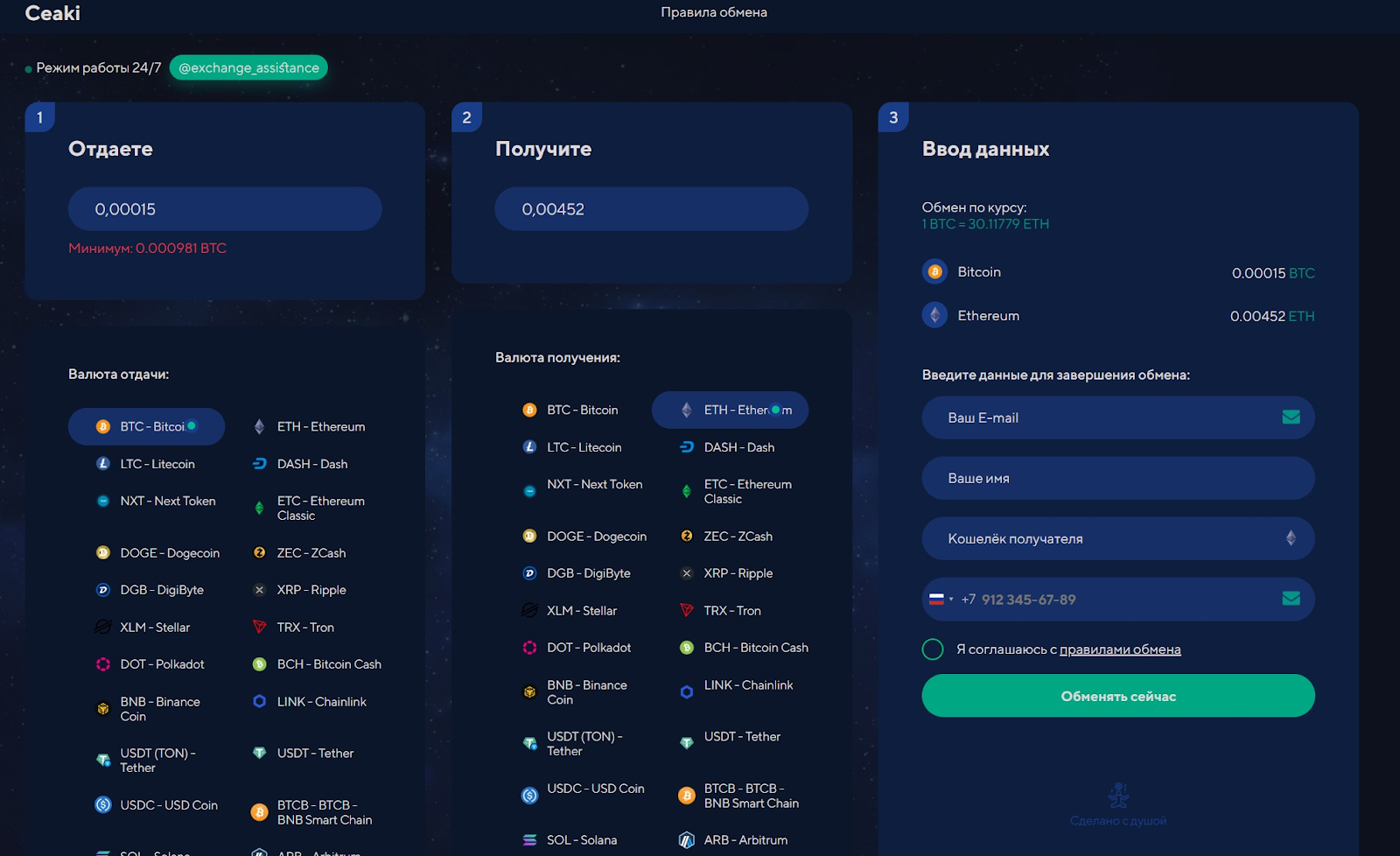 Криптообменник «Сеаки» оказывал свои услуги пользователям круглосуточно, без перерывов и праздников. В этом же режиме работал саппорт сервиса. Для связи с менеджерами техподдержки был предназначен телеграм-канал Support — Manager (@exchange assistance).