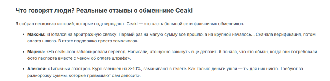 За все время работы платформа для обмена крипты не получила позитивных комментариев в свой адрес. Нашей командой не были найдены о сайте ceaki com отзывы, в которых бы упоминались выгодные курсы, быстрота обмена или профессионализм службы поддержки.