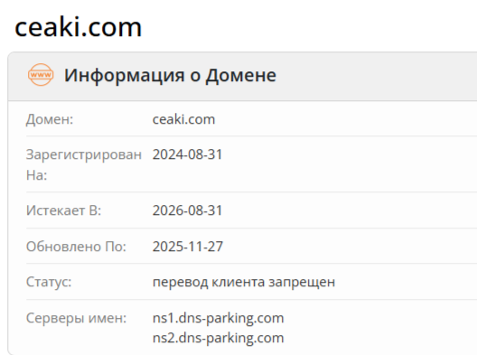 В результате проверки веб-сайта обменного пункта нами были обнаружены следующие детали. Домен ceaki com появился в интернете 31 августа 2024 года. Платформой для обмена крипты он стал лишь в 2025 году. Ни с какими мониторингами сервис не сотрудничал. Ввиду наличия большого числа негативных отзывов в интернете в декабре 2025 года обменник прекратил свое существование.